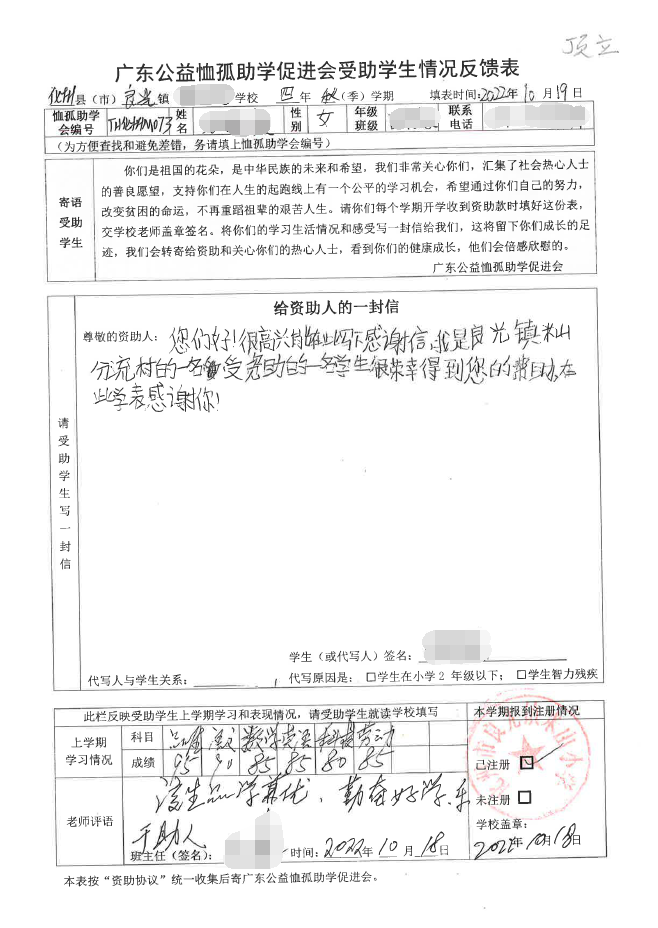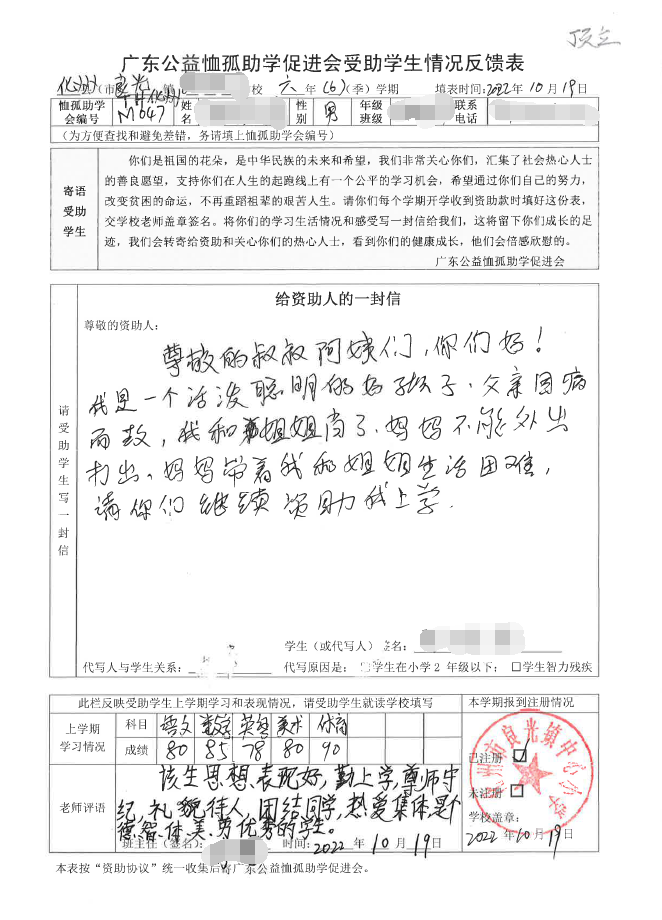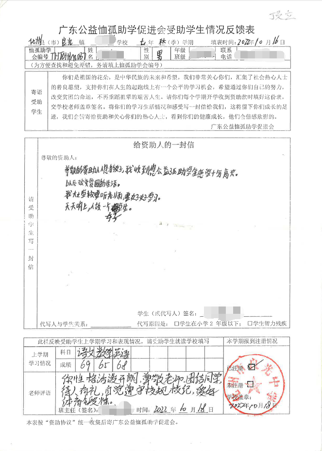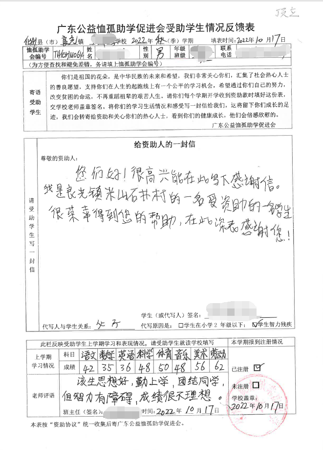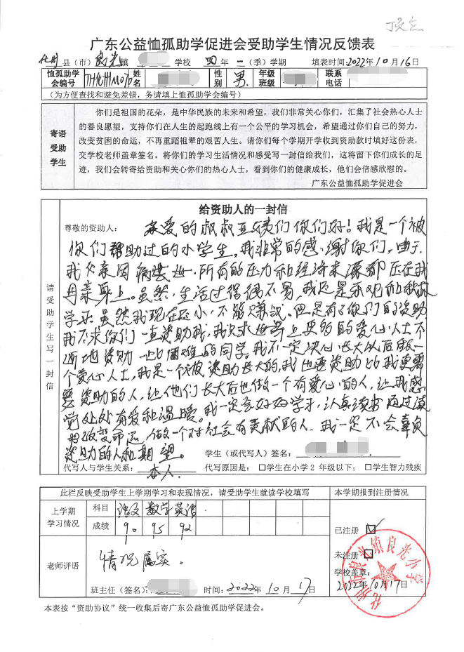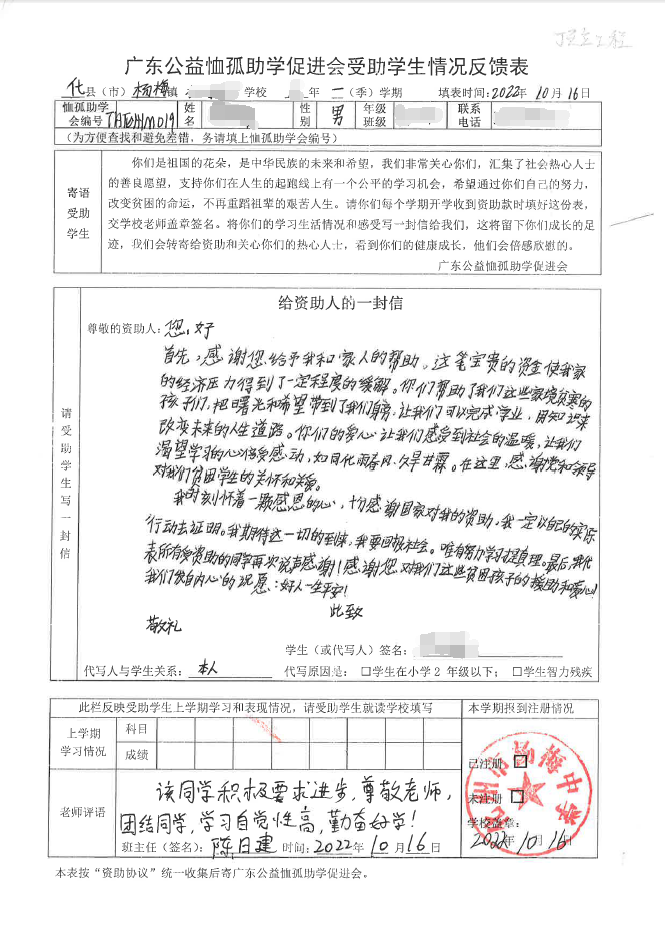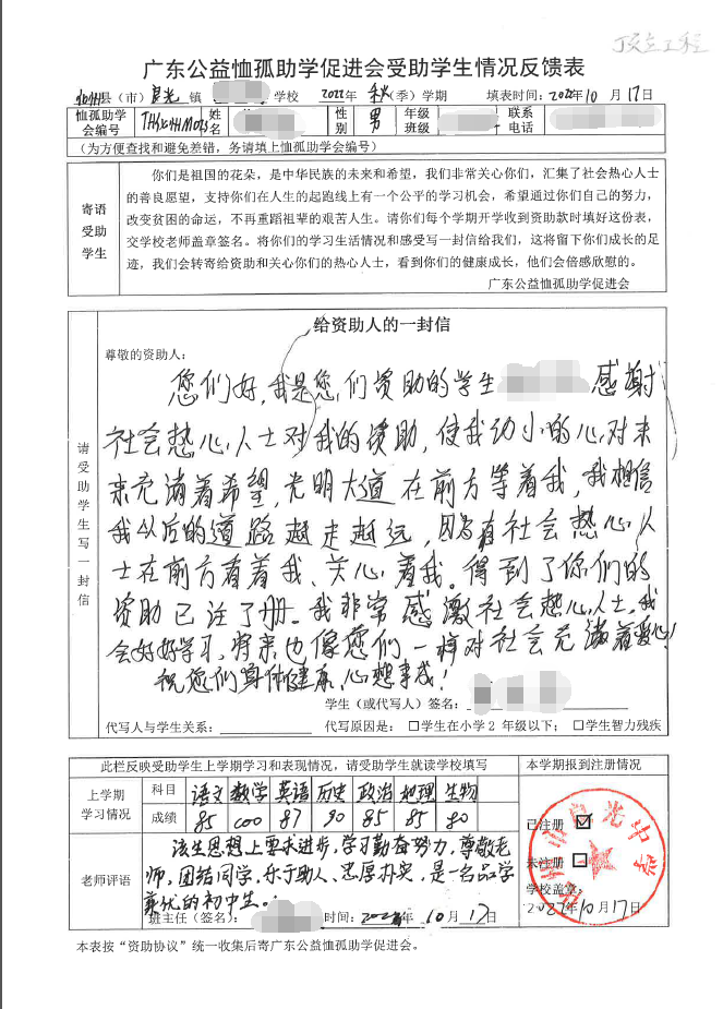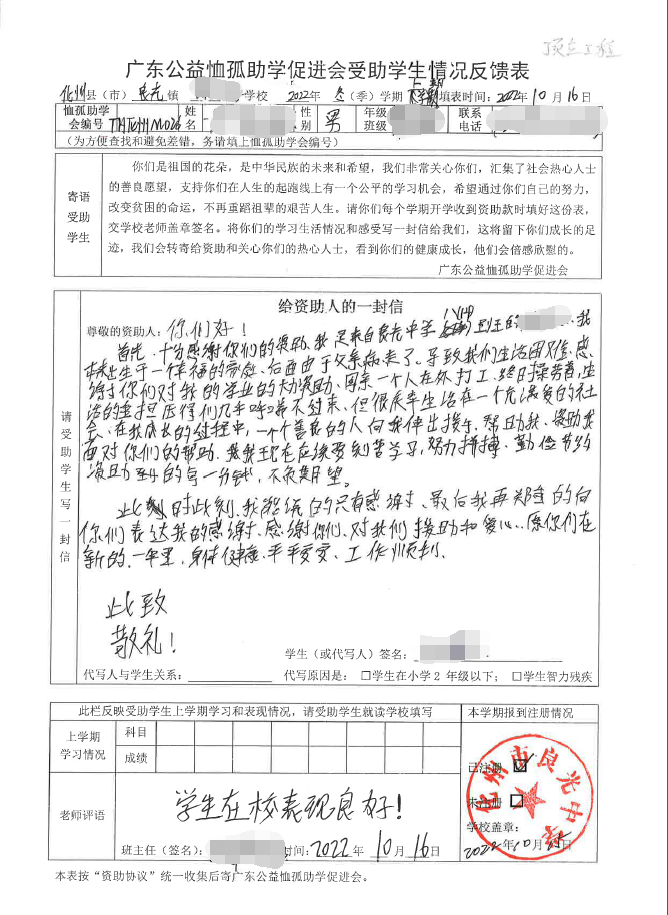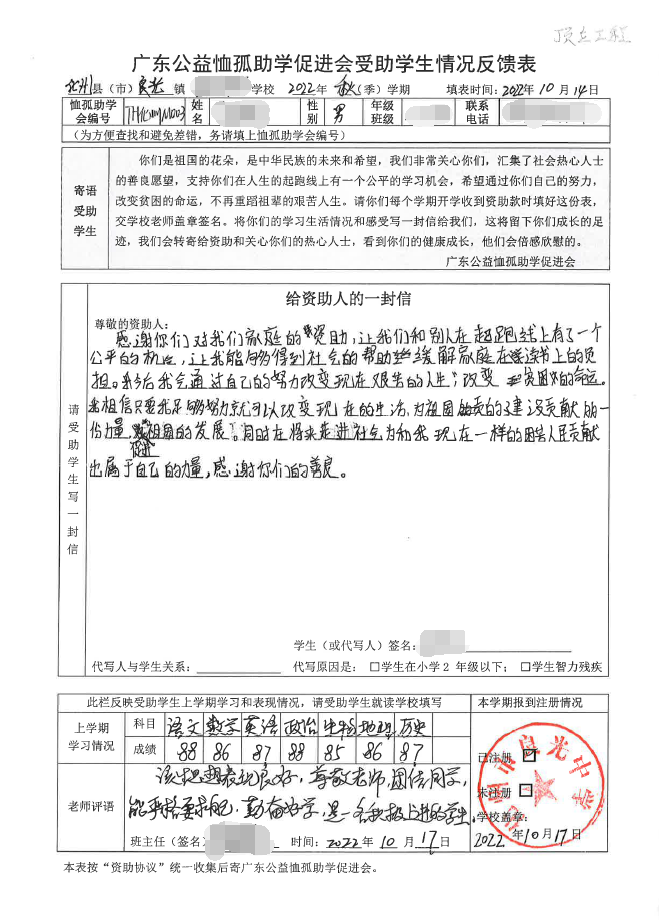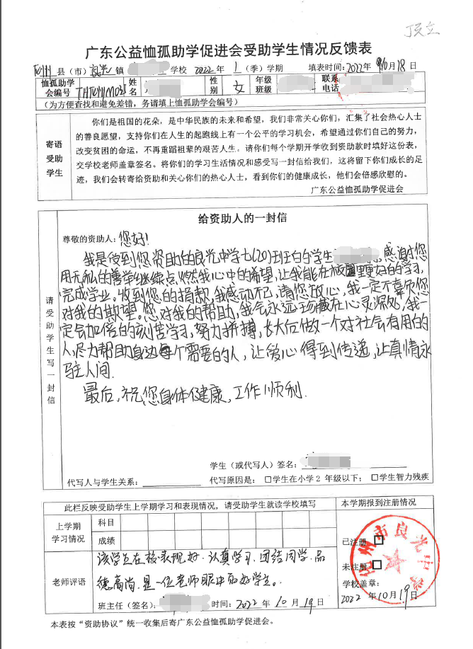 2022年7月,公司了解到廣東公益恤孤助學促進會舉辦慈善助學活動之后,發(fā)起了公司內(nèi)部慈善捐款活動,員工們積極參與,紛紛捐款,向有需要的學生奉獻愛心,向他們表達一份關愛。也許我們的愛心微不足道,但卻緩解了他們在學業(yè)上一定程度的經(jīng)濟壓力,改善了他們的學習和生活環(huán)境,也給他們帶來了希望。近期,廣東公益恤孤助學促進會將學生情況反饋表及受助學生對捐助人的一封信郵寄到公司,反饋了受助學生的學習生活情況,反饋表及信函里記錄著受助學生對學習的熱愛,也表達著他們對捐助人的感激之情,可以說我們小小的舉動給他們帶來了莫大的支持。